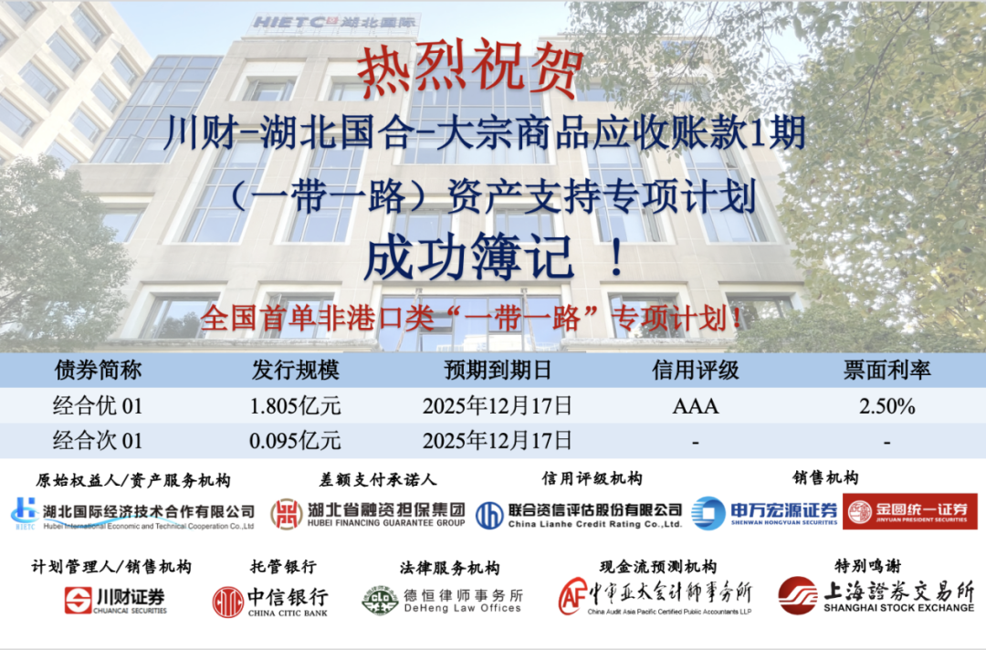 近日,聯(lián)投湖北建投國(guó)際經(jīng)合在上海證券交易所成功發(fā)行“川財(cái)-湖北國(guó)合-大宗商品應(yīng)收賬款1-10期(一帶一路)資產(chǎn)支持專項(xiàng)計(jì)劃”,儲(chǔ)架10億元,發(fā)行規(guī)模1.90億元,優(yōu)先級(jí)規(guī)模1.805億元,產(chǎn)品期限為12個(gè)月,票面利率2.5%。這是全國(guó)首單非港口類企業(yè)發(fā)行的“一帶一路”資產(chǎn)證券化項(xiàng)目,也是大宗商品貿(mào)易領(lǐng)域首單以發(fā)電集團(tuán)企業(yè)作為核心債務(wù)人,專注煤炭能源供應(yīng)鏈領(lǐng)域的資產(chǎn)證券化項(xiàng)目。